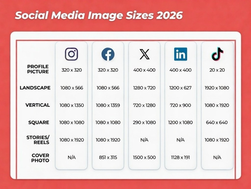 The correct social media image sizes in 2026 depend on the platform and where the image appears. However, a width of 1080 pixels is still the most common standard, with 4:5 and 9:16 aspect ratios working best on mobile-first platforms.